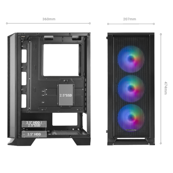 Le boîtier du MC-C a un aspect élégant et professionnel. Réalisé avec des lignes géométriques pures et des finitions haut de gamme, il se distingue par sa façade en maille métallique complétée par trois ventilateurs FRGB, qui maximisent la circulation de l’air et améliorent les performances de votre PC dans des conditions optimales, et par sa vitre latérale en verre trempé de la plus haute qualité.